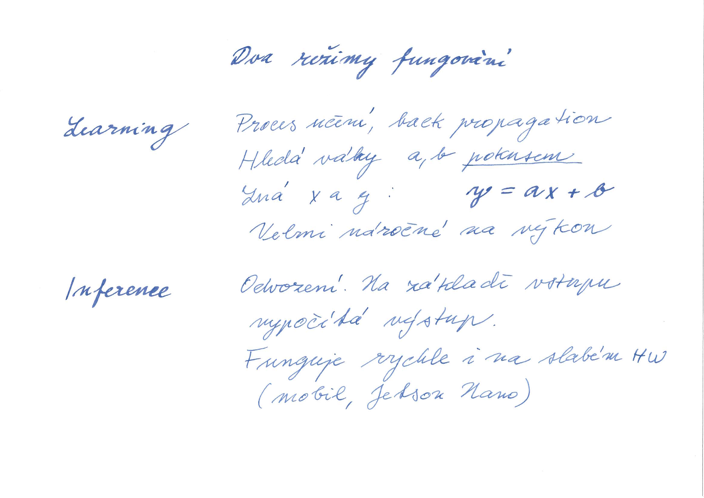 Inference – odvození – může být naproti tomu velice rychlé, takže pro využití natrénované neuronové sítě stačí i relativně slabý hardware. Proto může běžet třeba rozeznávání obličeje i v mobilním telefonu. Mobilní telefon je přitom z hlediska výkonu takový typický "počítač na baterky".