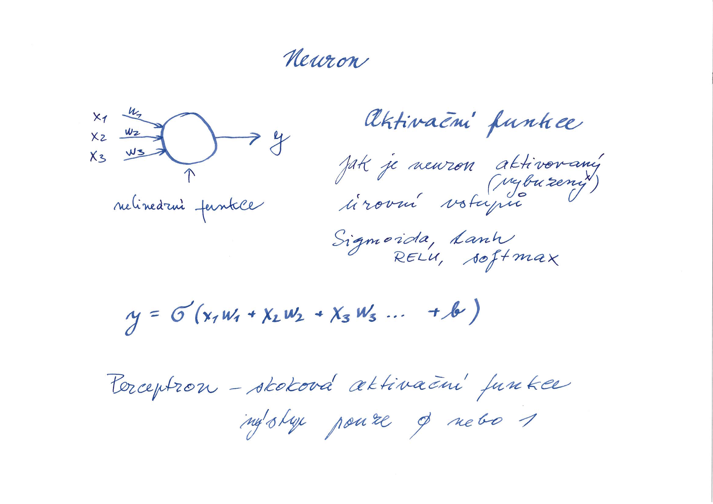 Jeden neuron implementuje v principu velmi jednoduchou matematickou funkci. Celým tímto textem se táhne rovnice přímky – lineární funkce. Svět kolem nás ale není lineární. Neuron je proto doplněný o nelinearitu v podobě aktivační funkce. Zde může velmi snadno dojít ke zmatení – běžný vývojář si pod aktivací představí něco jiného. Něco, co na začátku zpracování nastaví výchozí hodnoty. U neuronu však aktivace znamená něco jiného.