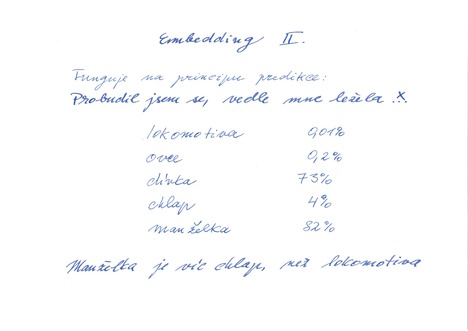 Embedding je schopný určit pro každé slovo pravděpodobnost, s jakou se toto slovo může ve větě vyskytnout. Slovo "manželka" bude mít pravděpodobnost velmi vysokou, slovo "lokomotiva" naopak velmi nízkou. To, že embedding označil pravděpodobnost lokomotivy jako nenulovou, bude způsobené pravděpodobně tím, že neuronová síť příliš často čučela na akční filmy.
